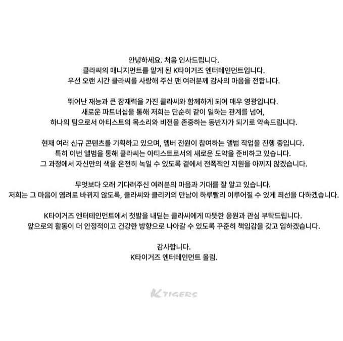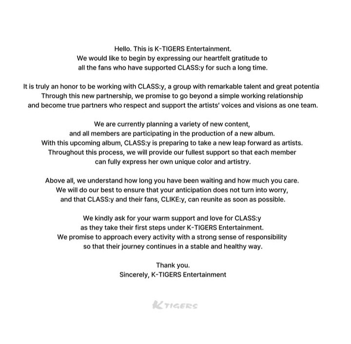 O grupo feminino CLASS:y, formado pelo programa de sobrevivência My Teenage Girl e debutado em 2022, inicia uma nova etapa em sua carreira com a mudança de gestão para a K-TIGERS Entertainment, conforme comunicado oficial divulgado na quinta-feira (13).