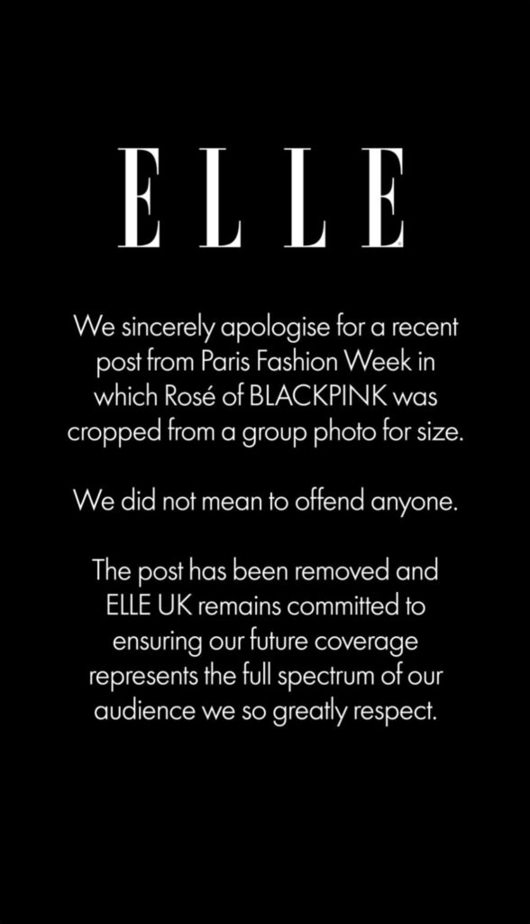 “Pedimos desculpas sinceras por um post recente da Semana de Moda de Paris no qual Rosé, do BLACKPINK, foi cortada de uma foto em grupo por causa do tamanho. Não tivemos a intenção de ofender ninguém.”
