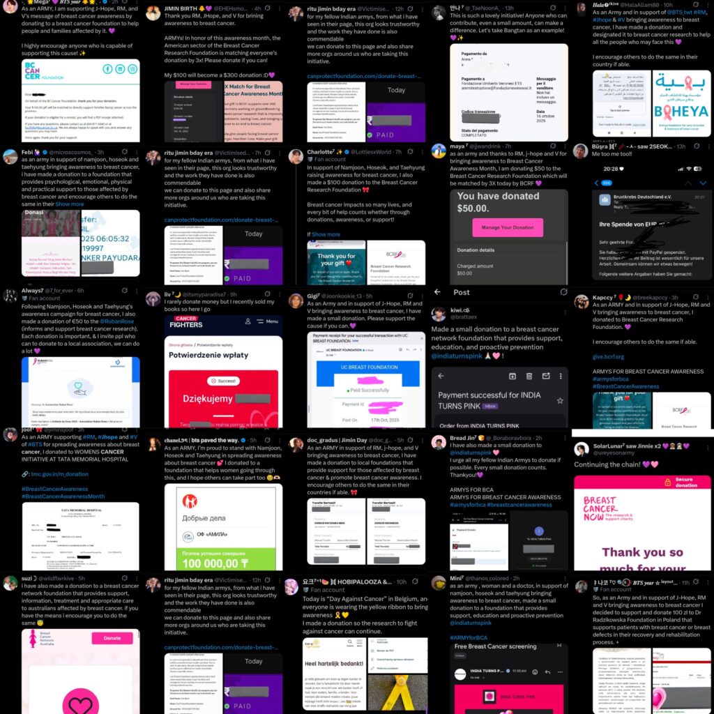 Nas redes sociais, especialmente no X (antigo Twitter), fãs começaram a publicar comprovantes e mensagens de apoio a instituições que tratam pacientes com câncer de mama. A ação se espalhou rapidamente por meio das hashtags #ARMYsforBCA e #ARMYforBreastCancerAwareness, que reúnem postagens de fãs de vários países mostrando doações.