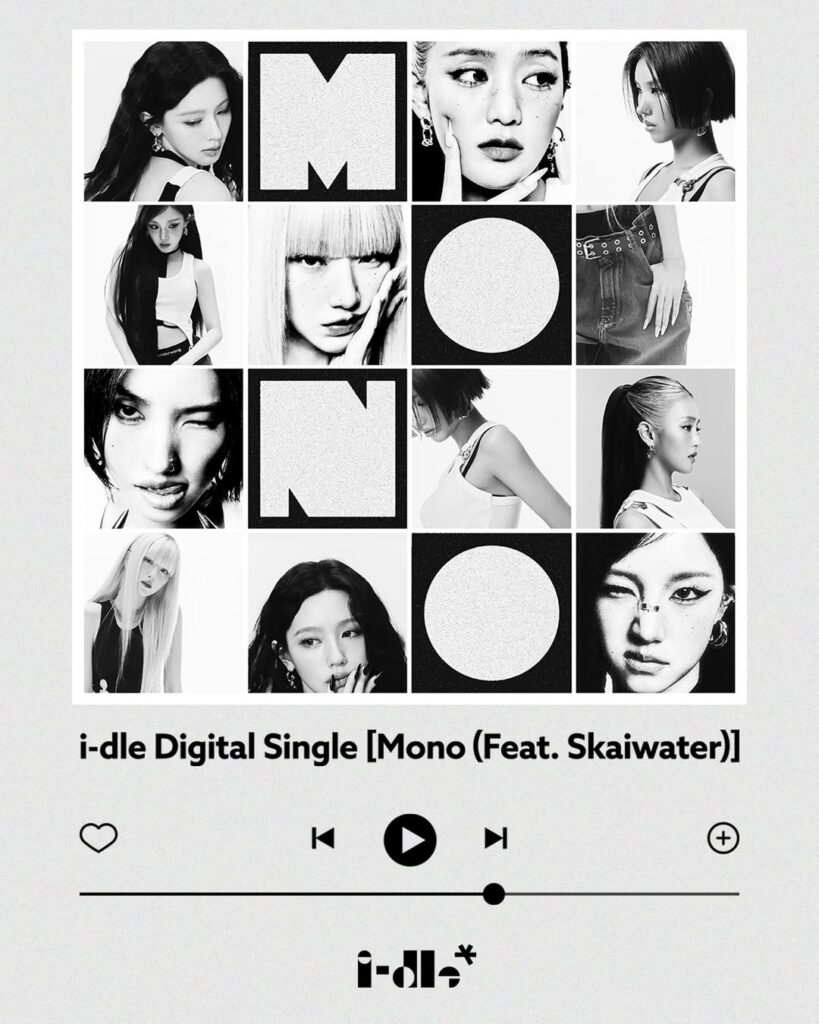 O grupo sul-coreano i-dle formado por Miyeon, Minnie, Soyeon, Yuqi e Shuhua, confirmou o lançamento do novo single digital “Mono”, que contará com a participação do artista britânico não-binário Skaiwater. A faixa será lançada no dia 27 de janeiro de 2026, às 18h (KST).