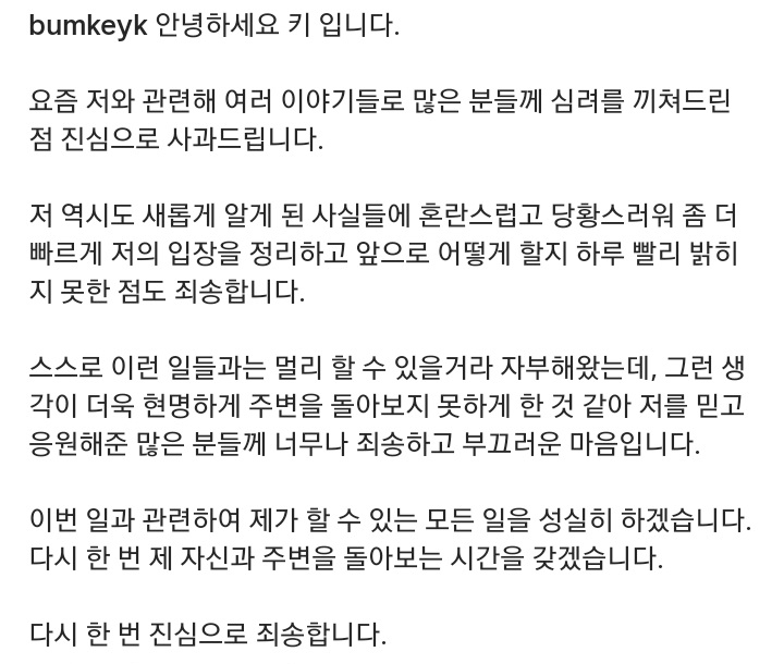 Em comunicado publicado em suas redes sociais, Key pediu desculpas ao público e afirmou estar confuso com os novos fatos, dizendo que pretende tirar um tempo para refletir sobre a situação.
