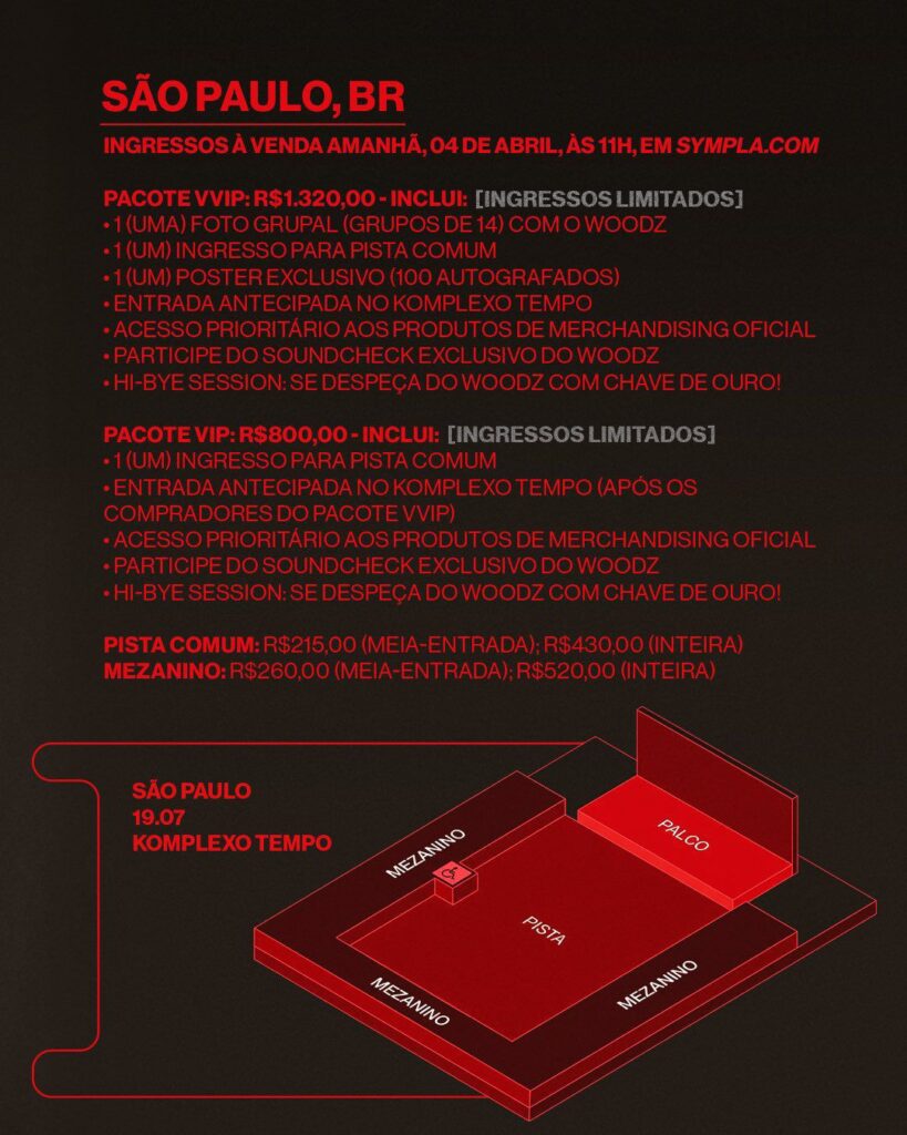A venda de ingressos começa hoje, 4 de abril, às 11h, por meio da plataforma Sympla. Os valores variam entre R$ 215 (meia-entrada para pista comum) e R$ 1.320 nos pacotes mais completos, que oferecem experiências exclusivas com o artista.